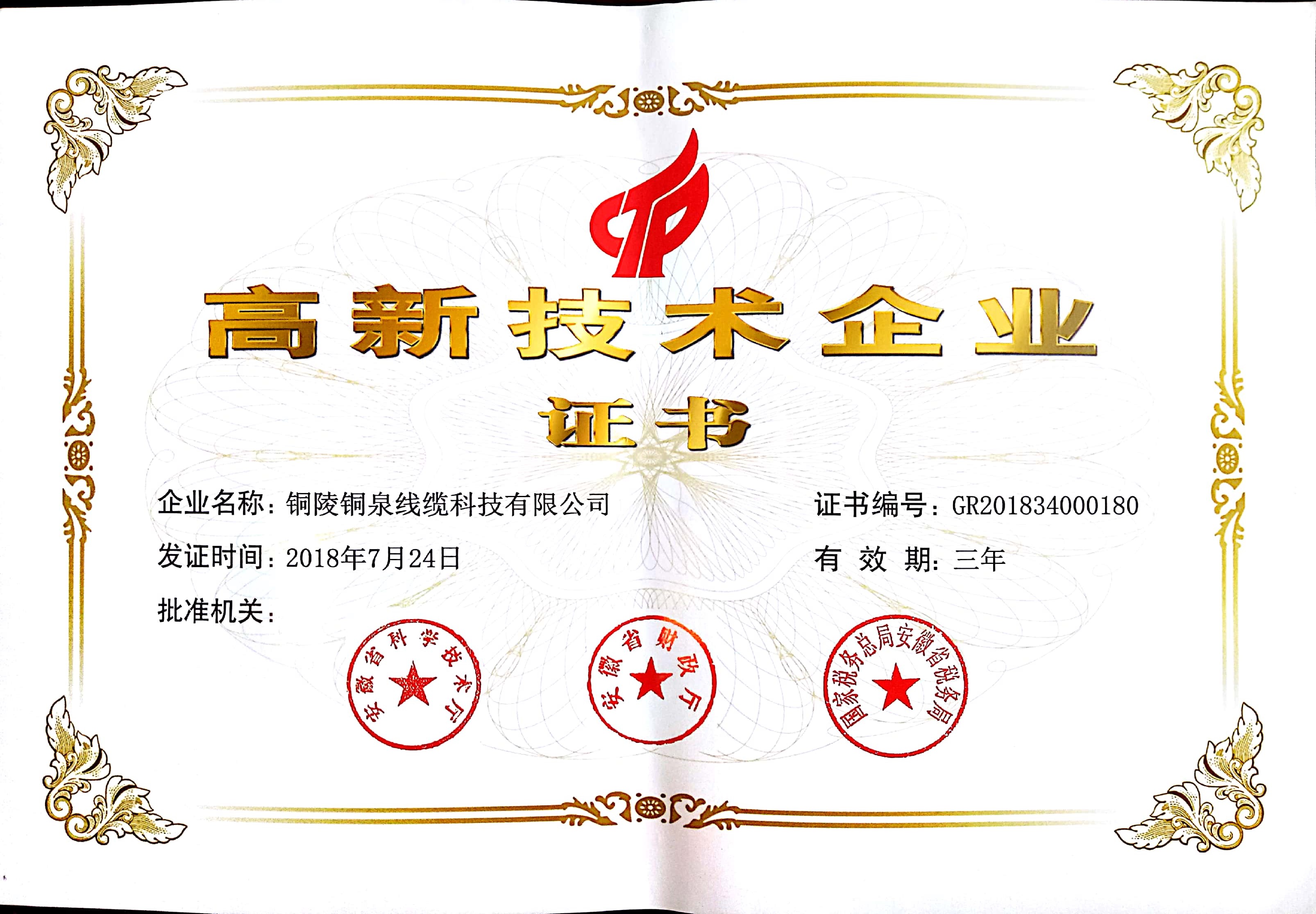 高新技術(shù)企業(yè)證書(shū)