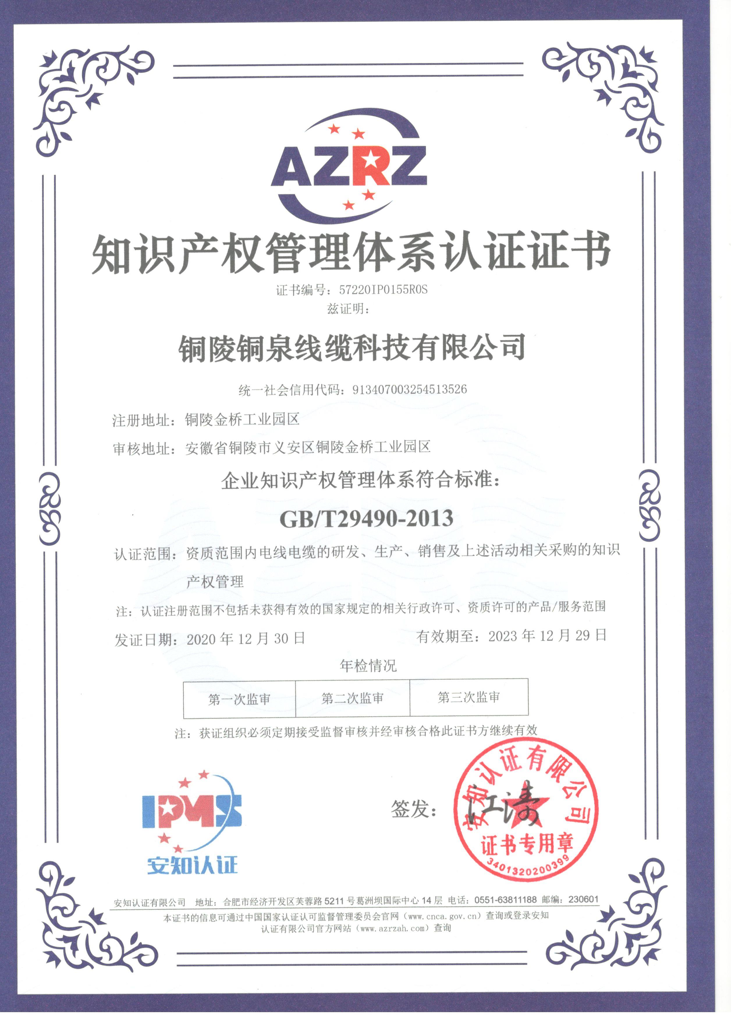銅陵銅泉線纜科技有限公司為建立企業(yè)知識產(chǎn)權(quán)工作的規(guī)范體系,認真貫徹落實《國家知識產(chǎn)權(quán)戰(zhàn)略綱要》,加強對企業(yè)知識產(chǎn)權(quán)工作的引導(dǎo),指導(dǎo)和幫助銅泉進一步強化知識產(chǎn)權(quán)創(chuàng)造、運用、管理和保護,增強自主創(chuàng)新能力,實現(xiàn)對知識產(chǎn)權(quán)的科學(xué)管理和戰(zhàn)略運用,提高國際、國內(nèi)市場競爭能力。